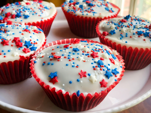 Cupcakes were made using 1/8 tsp of orange oil to flavor the cake batter. The icing was flavored with chai extract, as described in my post from a couple of months ago. Patriotic sprinkles complete the look…