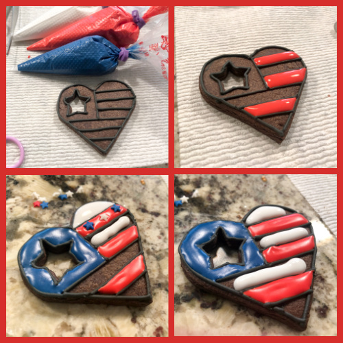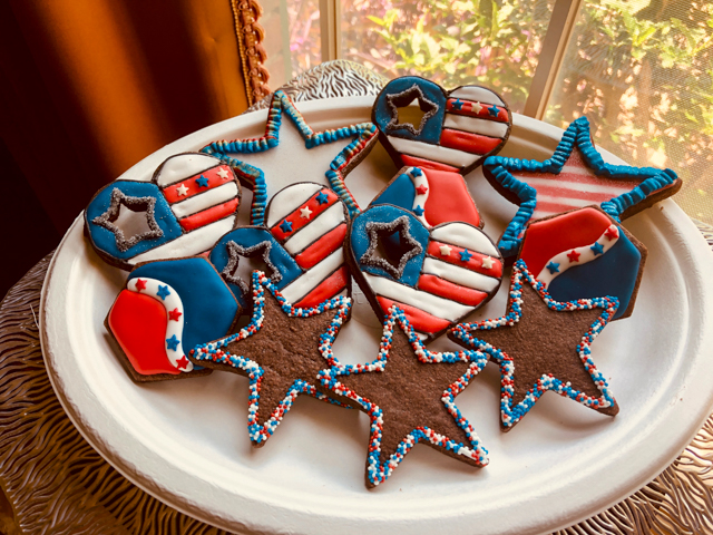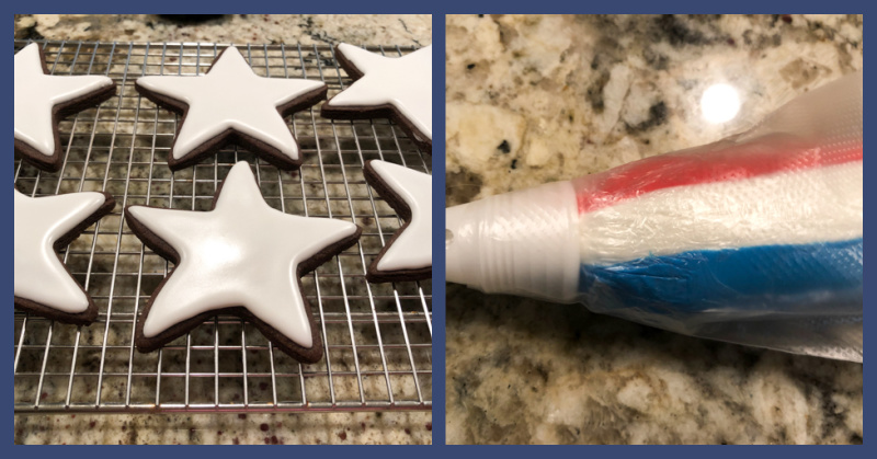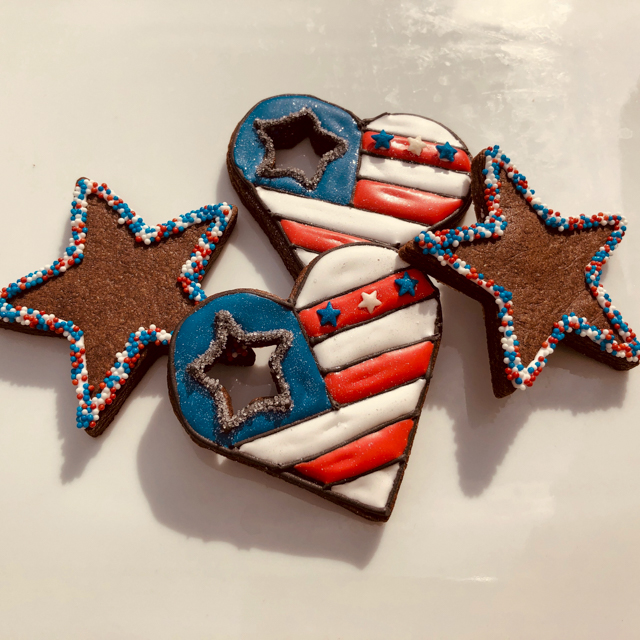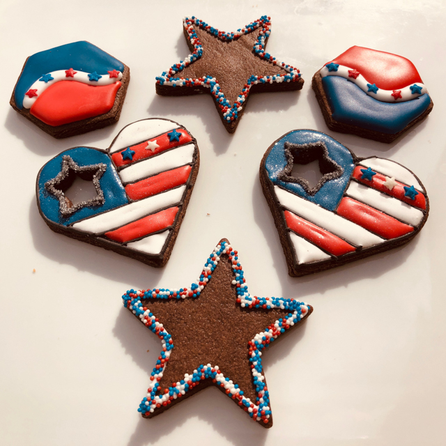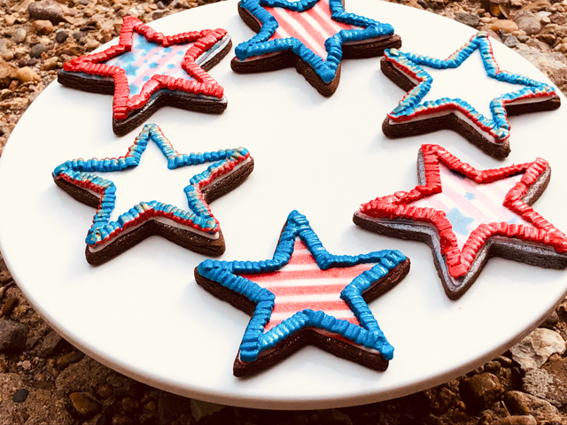 These stars were inspired by Haniela. They started with a flooded white cookie, and then some were air-brushed with a combination of stencils (stripes and stars), and some were outlined with a three-color icing using a flat icing tip.