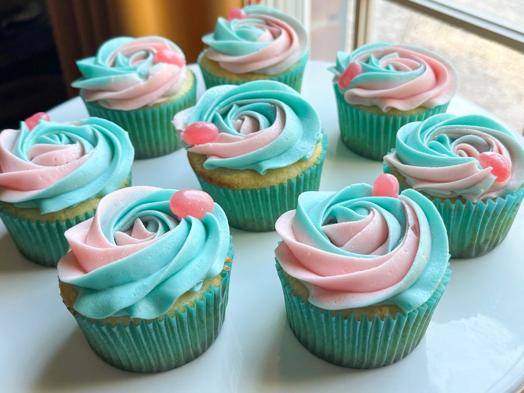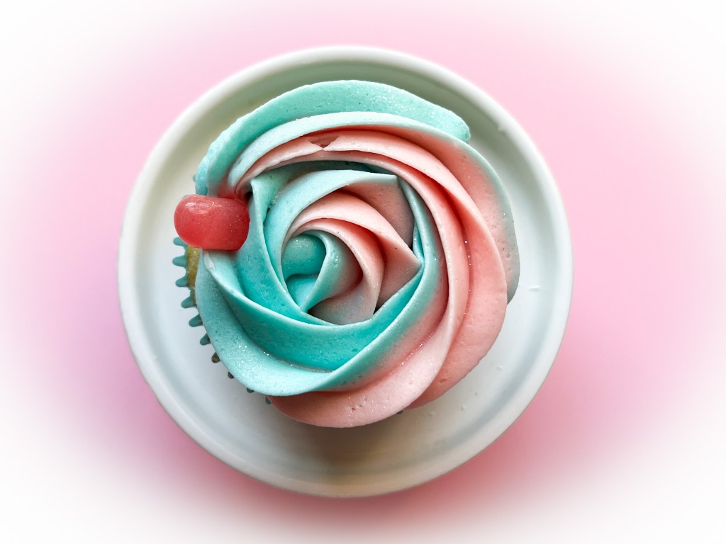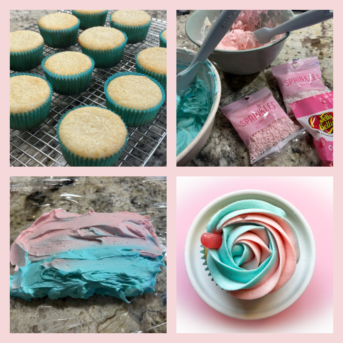 In the book they suggest dividing the batter in two portions and adding pink to half, blue to half. I totally forgot about it. So my cupcakes were pure white. The frosting is marbled and the cotton candy flavor comes from LorAnn (click here). I used Cotton Candy jelly bean to decorate each cake.