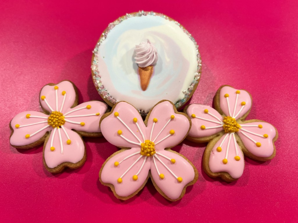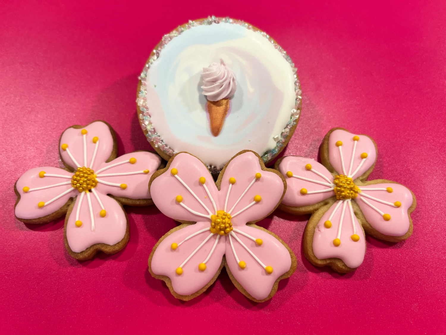 For these cookies, you will need white Royal icing to flood the surface, and if adding flowers as transfers, place them immediately on top. The upper, central cookie was decorated with simple royal icing using a tipless bag, after the flooding set.
