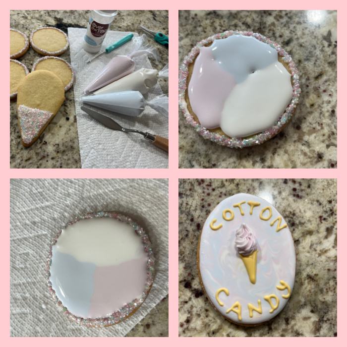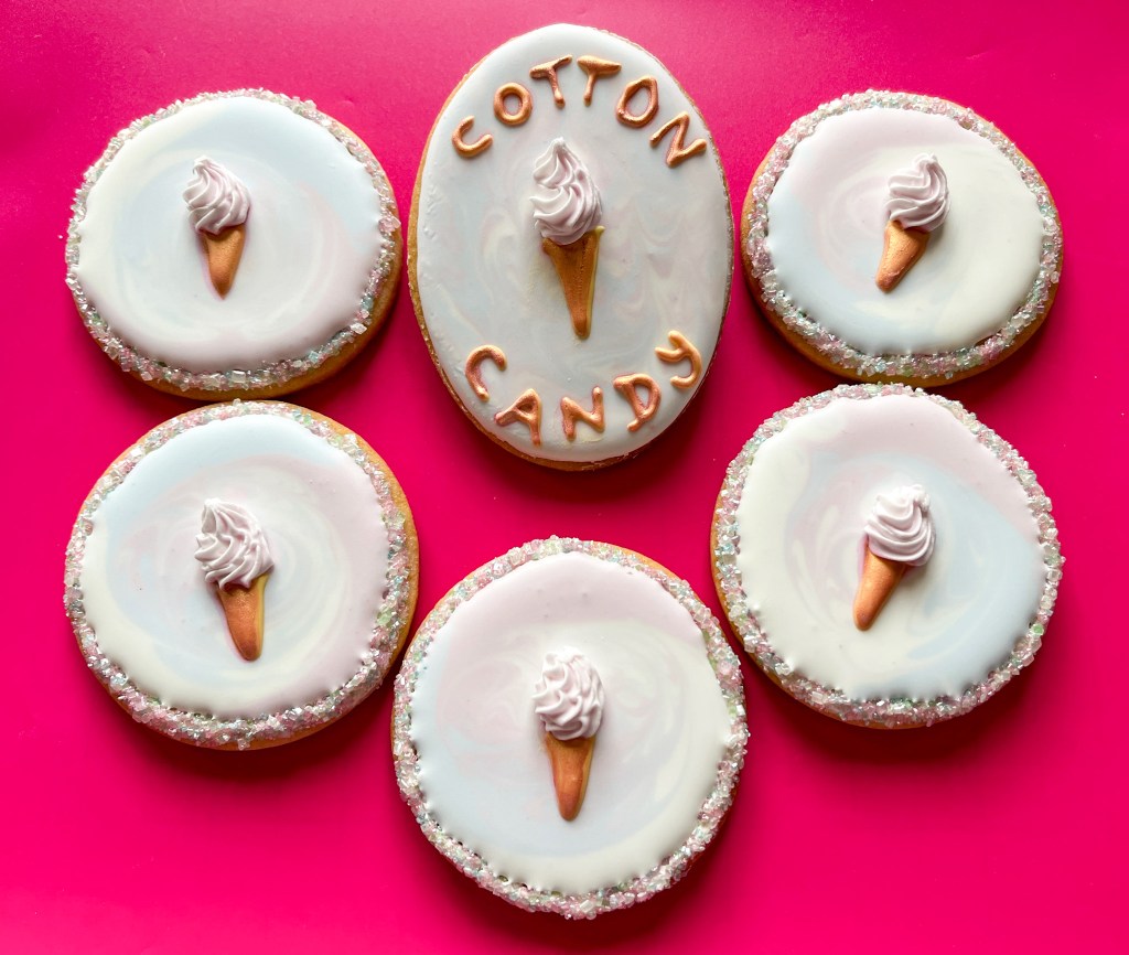 Royal icing in pastel pink, blue and white, flooding consistency. Royal icing in thick consistency for cotton candy (I used pink) Royal icing in piping consistency for writing and cone (I used gold) Sprinkles for edges.