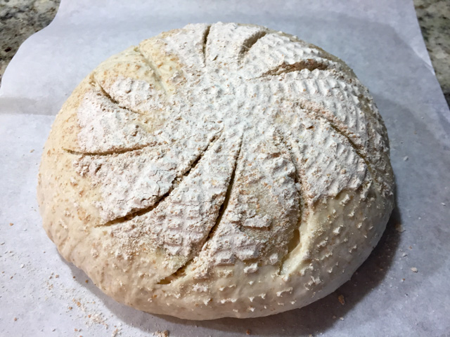 Invert the dough on a piece of parchment paper and score with a new razor blade, if so desired, or simply make a cut on the surface in the shape of a cross with a very sharp knife.
