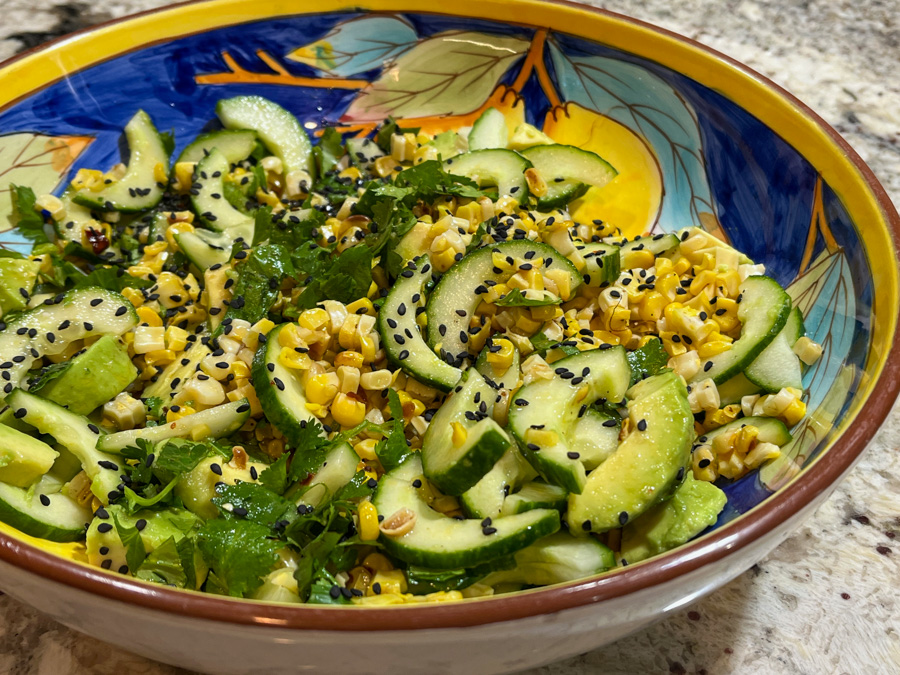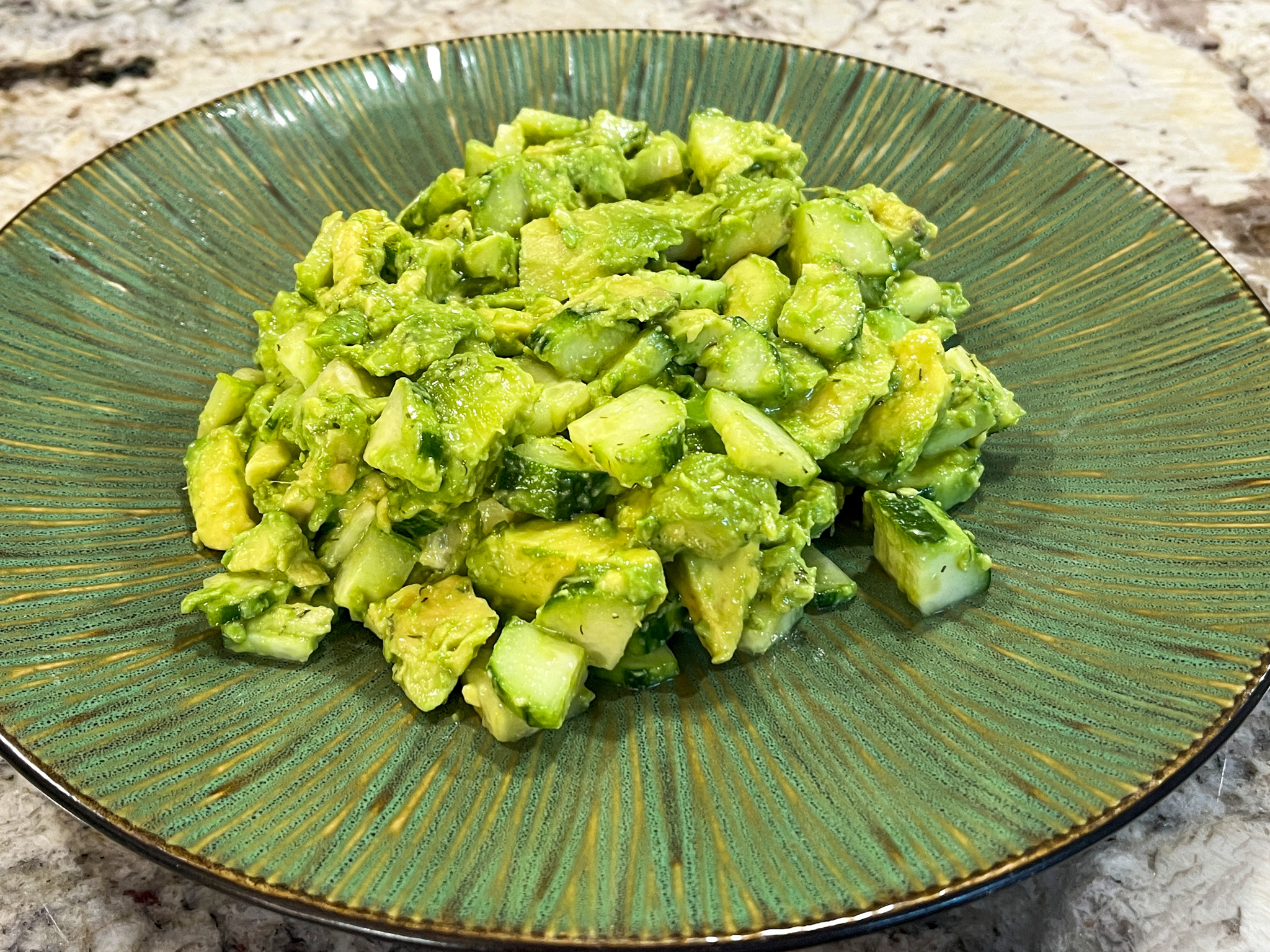 Shake the cucumbers in the colander to get rid of any excess moisture, rinse briefly then transfer to the bowl with the avocado. Drizze olive oil, and add dill. Mix well but gently, the avocado should start getting creamy and cover all the slices of cucumber. That is a good thing. Serve with a sprinkle of red pepper flakes, if so desired.