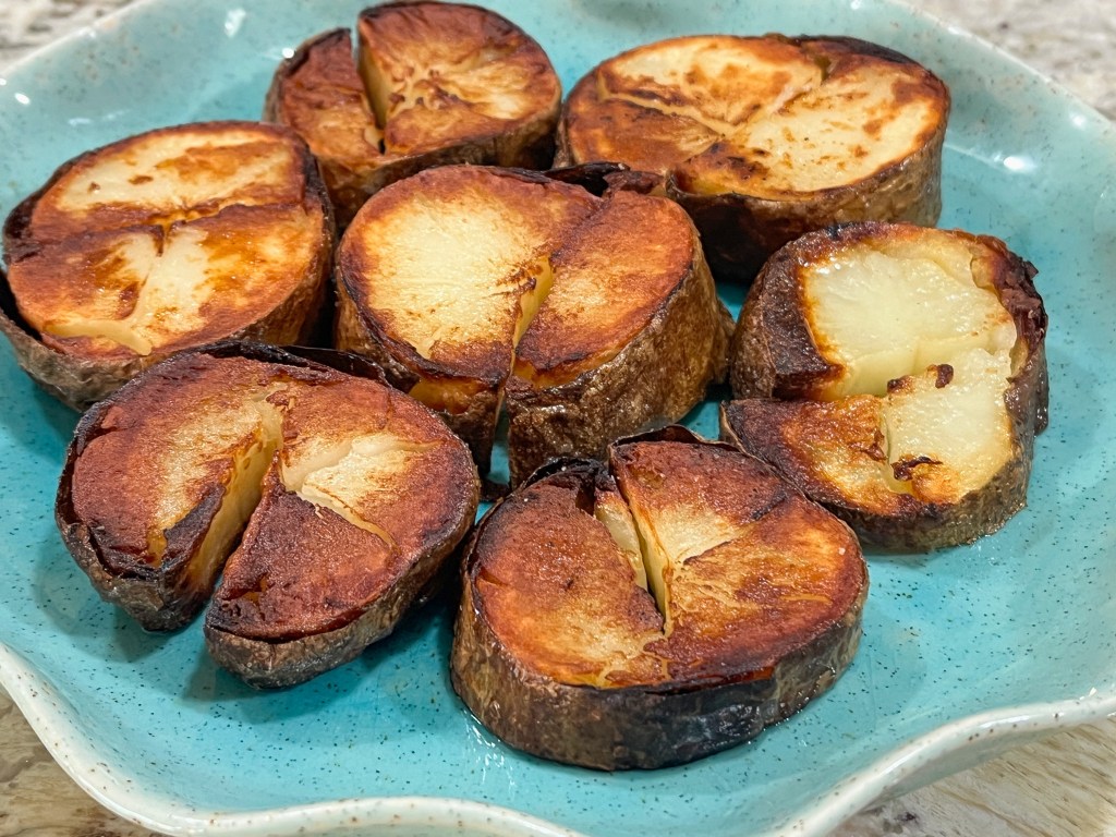 Simply grab the leftover roasted potatoes from the fridge, and cut in slices that should not be too thin, not overly thick, as they will warm up exclusively on the skillet. Add olive oil to the pan, once it is really hot, add the slices and brown them on both sides. Add a little more salt to serve. They will be super creamy inside and get that superb crust all over. Addictive, I tell you.