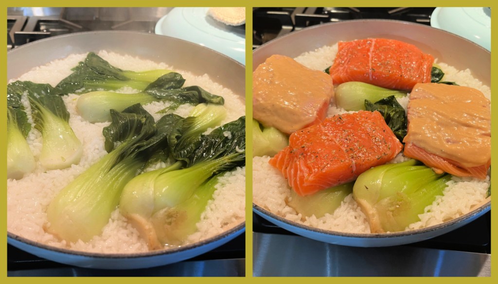 After 15 minutes, carefully uncover the braiser and lay the salmon pieces over the rice and bok choy. Cover again and continue to bake until the rice is tender and the salmon is just cooked through, about 15 minutes more.