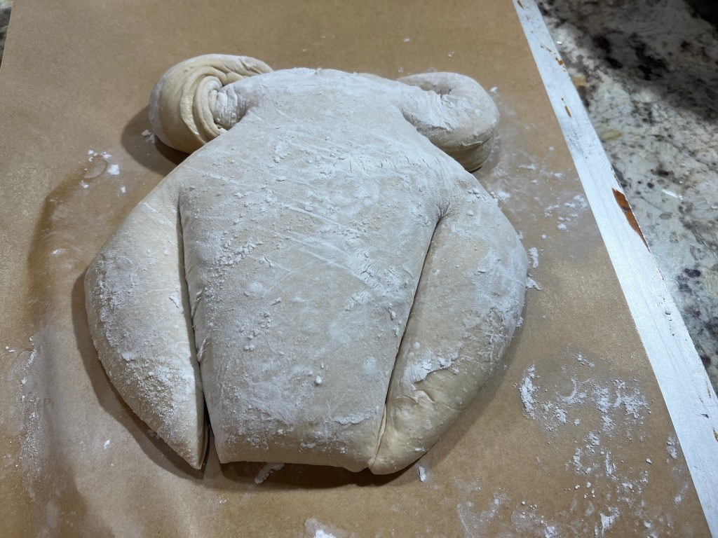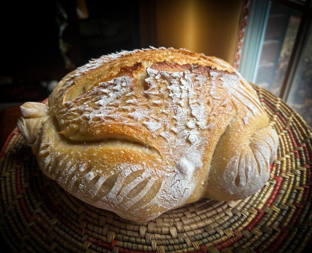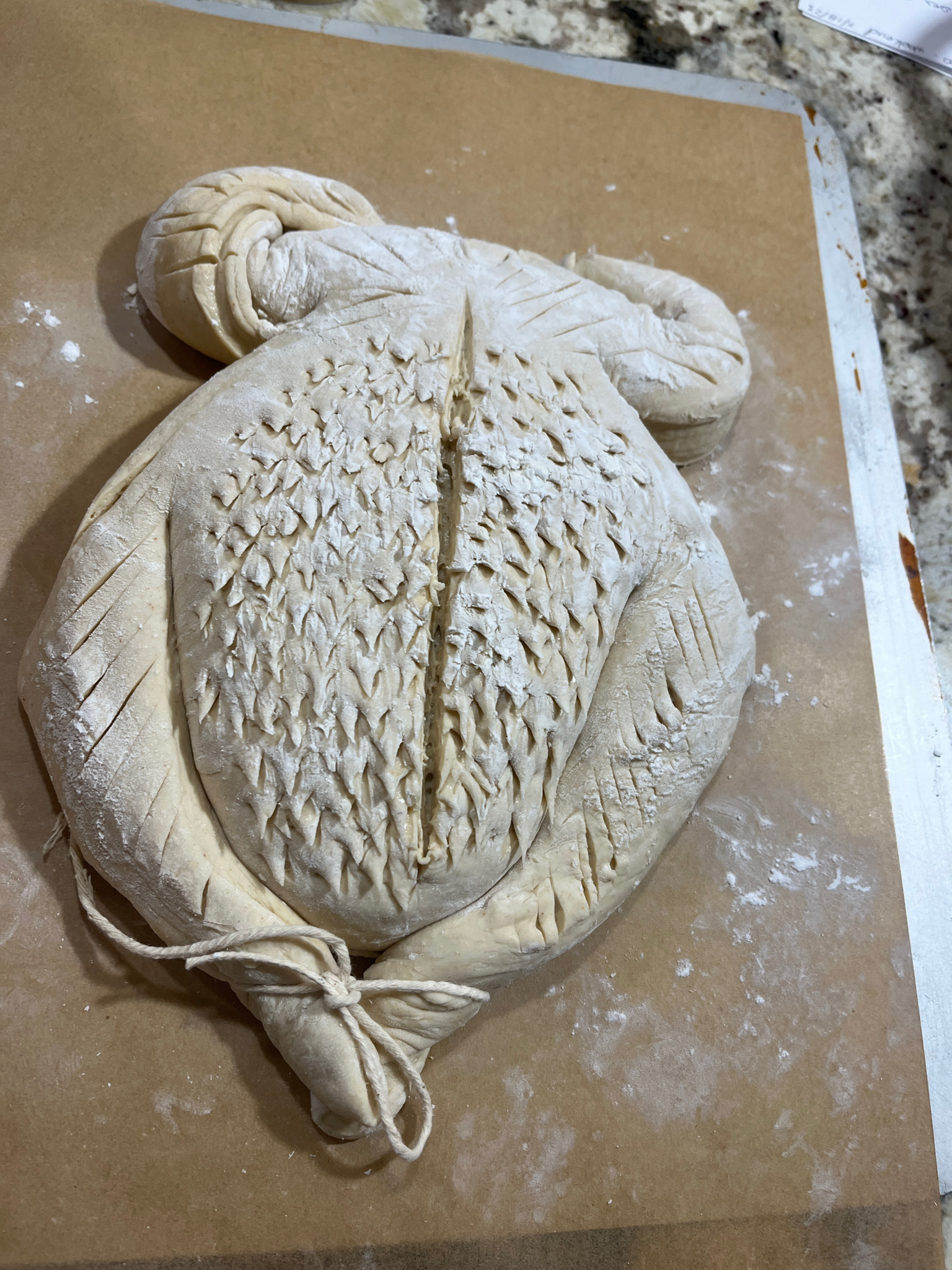 I used a basic sourdough recipe (500 g bread flour, 75 g sourdough at 100%, 345g water, 9g salt, 1/2 tsp paprika). Did my usual method that starts with a 4-minute ride in the KitchenAid at low speed, then folds every 45 minutes for 4 and half hours. Shaped, into the fridge it went for its beauty sleep. Next morning, the fun began, shaping it as a small bird. Most of the examples I’ve seen around turn out with the legs and wings away from the body and I thought it was a little awkward to slice and eat. I decided to contain it all in a more round shape. Maybe it did not end as “turkey-ish” as some, but I like it this way.