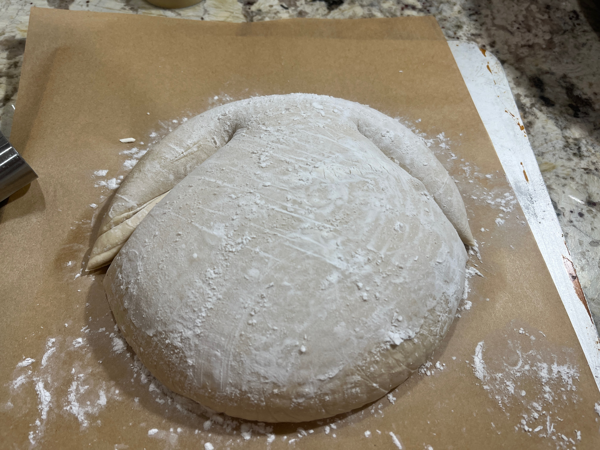 The braiding. Not. For. Sissies. Keep in mind, there were no written instructions or diagrams. Just a video. The woman knows what she’s doing, and she moves fast. One piece of advice, keep track of the time it takes you to braid, and take that as part of the  proofing. It took us 45 minutes to wrap this baby up in strands. Don’t judge us. Thank you.