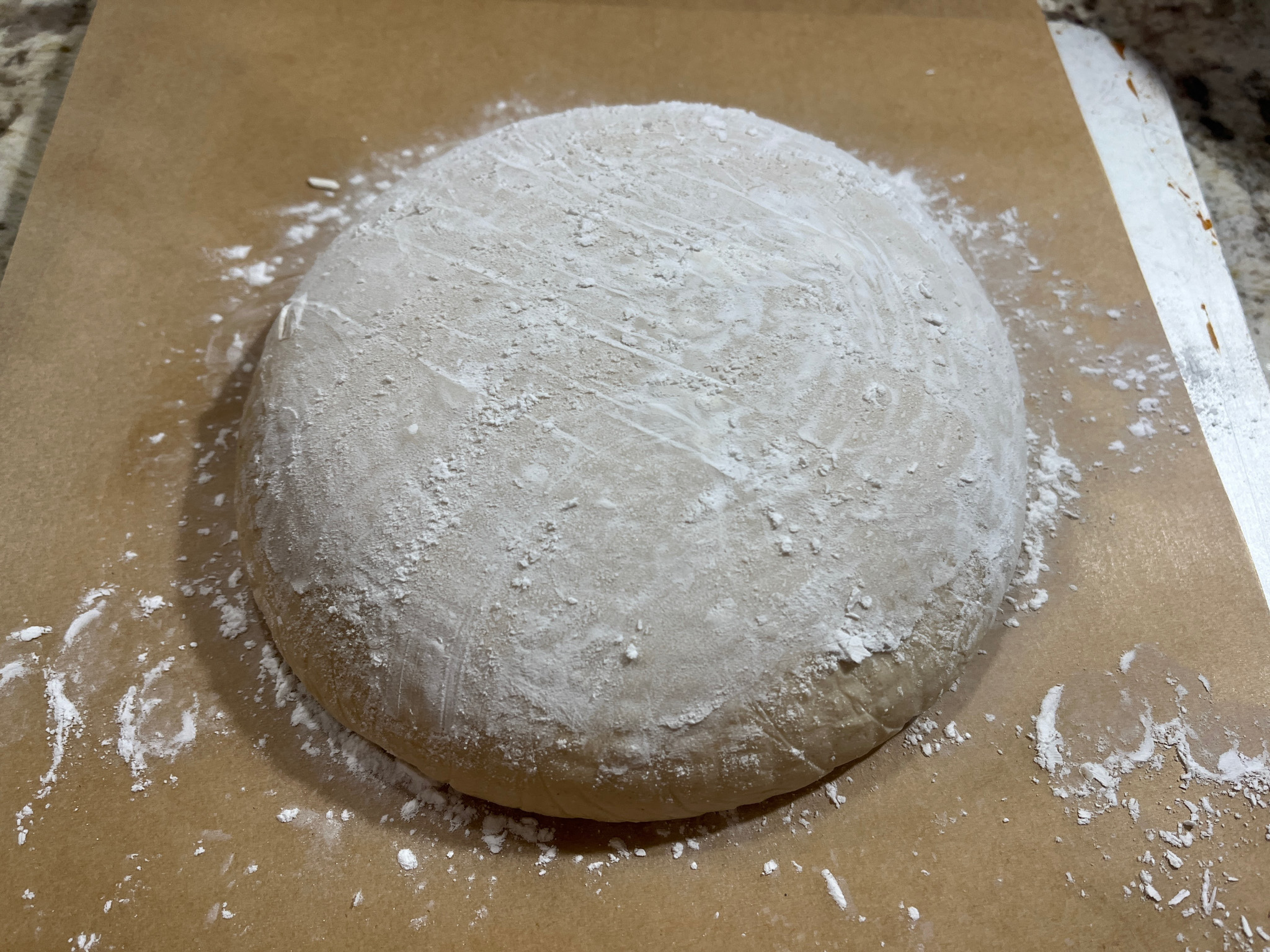 Start from a round proofed dough, dust with flour (I like to use tapioca flour).