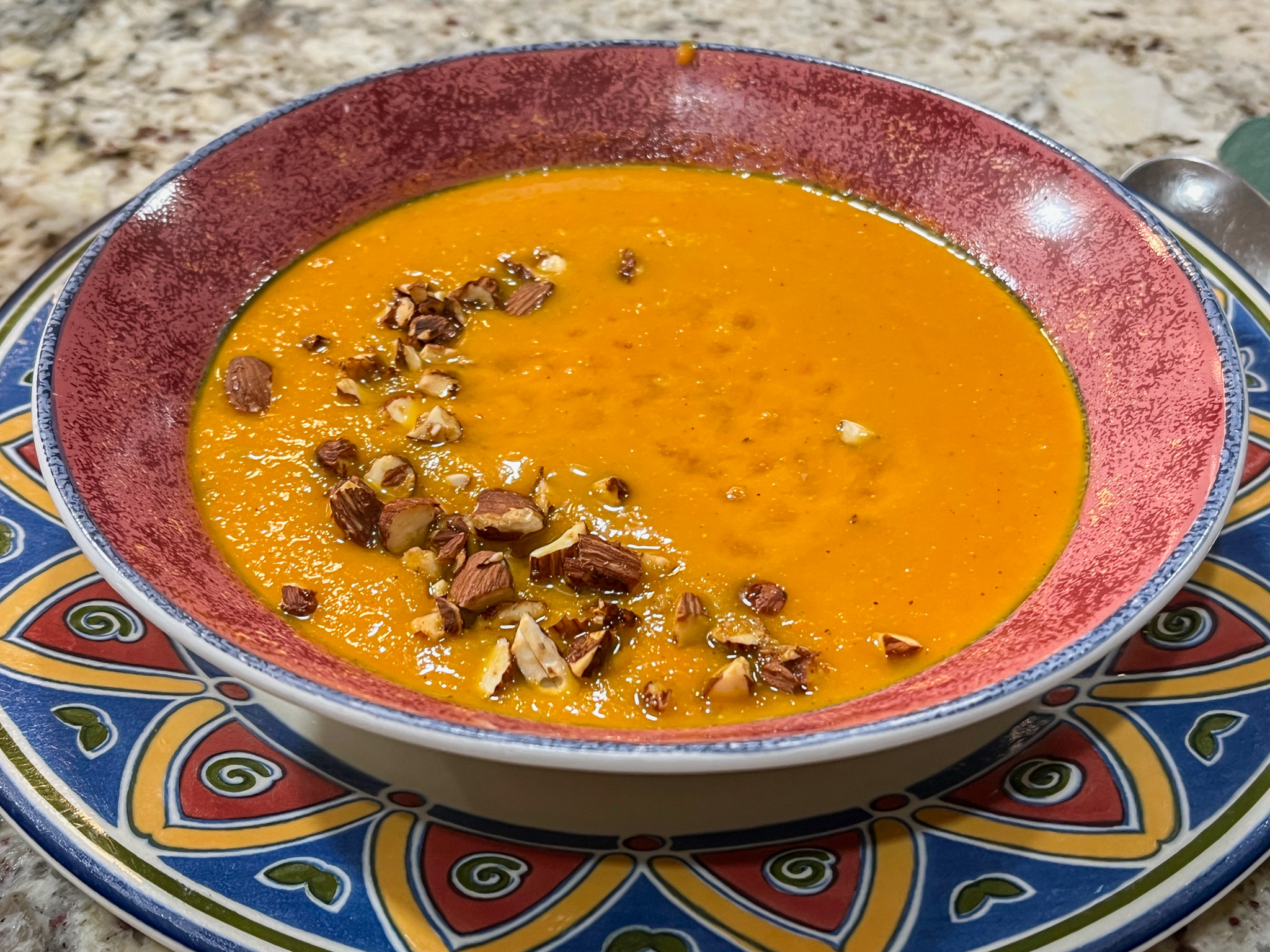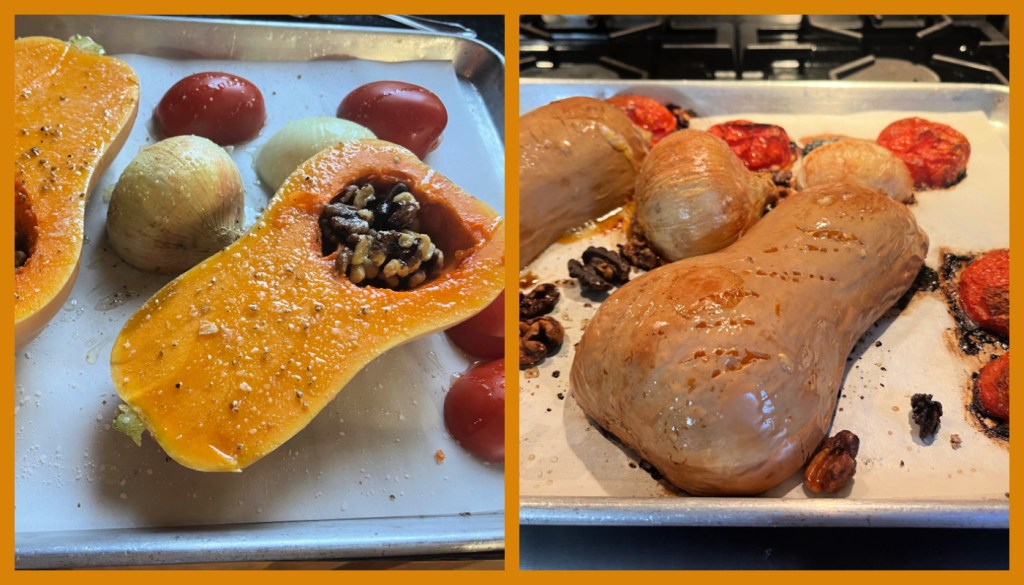 Comments: This is an amazing soup, the taste is complex, warm, absolutely wonderful on a chilly evening. If you protect the walnuts under the little hole of the butternut squash, they won’t burn during the roasting time. If some are left unprotected, check after 25 minutes or so, and remove when nicely roasted but not burned.