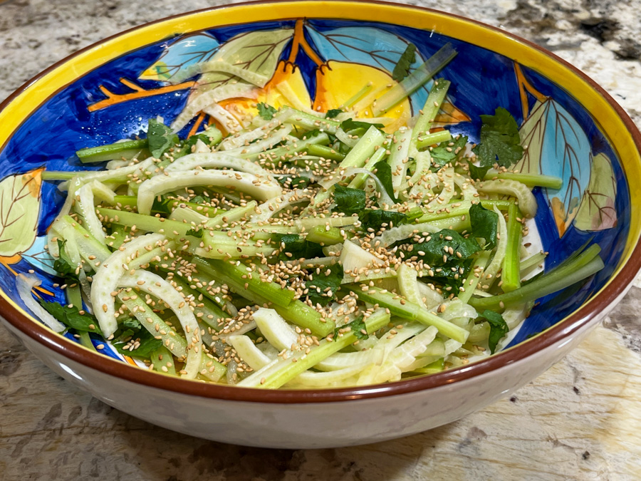 Make the celery salad: In a large bowl, whisk together sesame oil, rice vinegar, pepper and salt. Toss with celery, fennel and cilantro. Taste and add more salt, sesame oil and rice vinegar if needed.