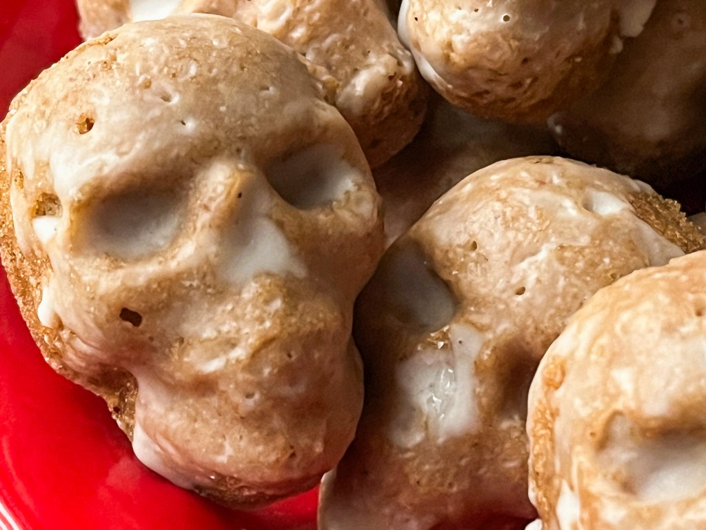 Make the glaze by whisking all ingredients, adjust with milk or powdered sugar. Coat each skull cake with the glaze, let it set at room temperature.