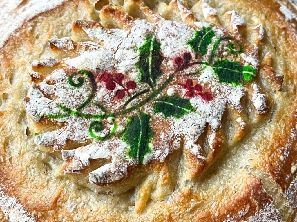 Next morning, heat the oven to 450F. Invert the dough over parchment paper, carefully place the stencil on top, and dust with flour. Make sure to rub the flour well into the design, a small brush is helpful. Lift the stencil and place the dough in a Dutch oven.