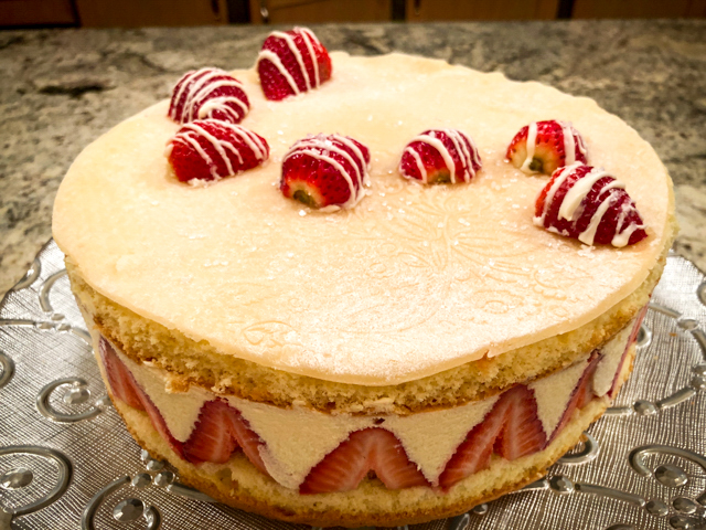 Another possibility that makes this cake even more appealing is to completely hide the cake when assembled. You achieve that by placing the strawberries outside the perimeter of the cake, which is then cut about one inch smaller than the ring. The mousseline will be outside, on the sides and top of the cake. You can see one beautiful example here.