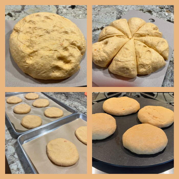 Heat a griddle until water evaporates quickly on contact with the surface. Cook each side of the little buns for a couple of minutes, until a golden crust forms. Place them all in the oven for 20 minutes to finish baking. Internal temperature should reach 200-205F.