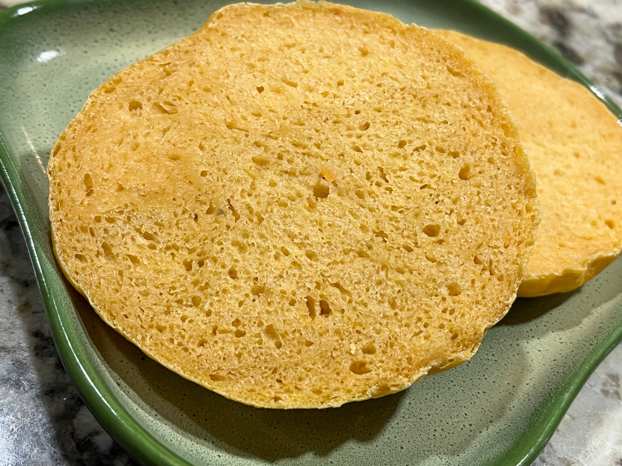 Think of an English muffin, but richer, more tender and with the most beautiful color offered by orange-fleshed sweet potatoes. Very easy to make and thanks to instant yeast, pretty quick to have at the table. Some recipes call for cooking it exclusively on a griddle, but I find it almost impossible to bake it fully without getting the surface too dark. I prefer to start them on a griddle and finish baking in the oven. They turn out much better this way.