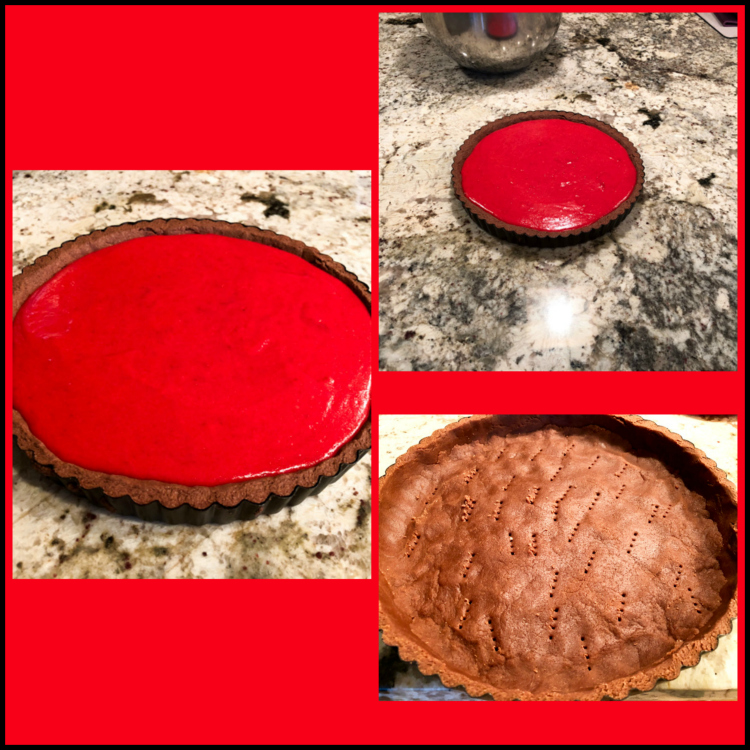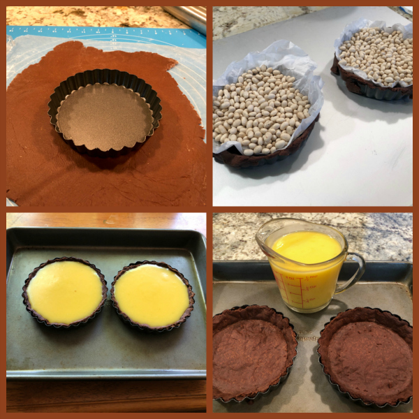 Heat oven to 350 degrees. Spray the bottom of an 11”x1” quiche pan with removable sides in the center only. Set aside. Combine flours and cocoa in bowl of mixer. Mix briefly to combine. Add butter and cut in until very fine. Add sugar and baking powder. Mix to combine. Add egg and egg yolk; mix until it balls up and rides the blade. Remove from the processor and divide in half.