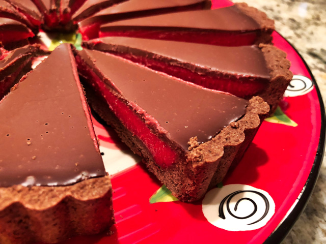 The color of the cranberry curd is something! I shared a few photos on my Facebook page, and some of my friends were wondering how to get the finalized tart to show the curd, maybe reducing the glaze to a zig-zag drizzle, or putting the glaze underneath the curd instead.  Having tasted it, I think the tartness of the curd really benefits from a nice layer of ganache on top. So the striking beauty of it will have to be appreciated only after slicing. Gastronomic compromise.