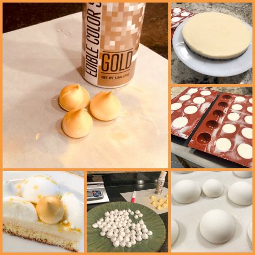 My schedule went like this: I made the biscuit dough on a Friday evening, baked it Saturday morning and made the mini-meringues, the chocolate ganache and the mousse on Saturday afternoon. Once the ganache cooled enough I spread it over the biscuit base and froze it. Sunday afternoon I un-molded the frozen mousse spheres, sprayed some of the meringues with edible gold color, and assembled the tart.
