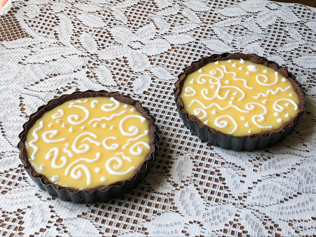 I made some decorations with tempered chocolate to add to the top. Would love to repeat this tart using the grass tip as demonstrated in the tutorial, because the look that gives is simply stunning! But I only had very small grass icing tips that are used for cookies, and that did not work at all for the top of the tart. Obviously, that gave me the opportunity to order the correct tip. Are you surprised? 😉