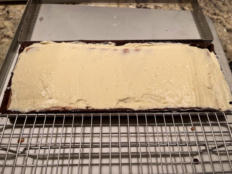 Make the chocolate ganache. Melt the chocolate gently in the microwave or in a double boiler. Heat the cream to simmering (about 175 F). Add to the chocolate in three additions, whisking gently to fully incorporate the chocolate and the cream.  Reserve. Cool to about 90F before pouring into the cool base. Place in the fridge to cool completely and then in the freezer overnight.