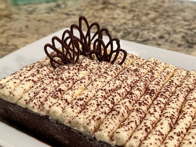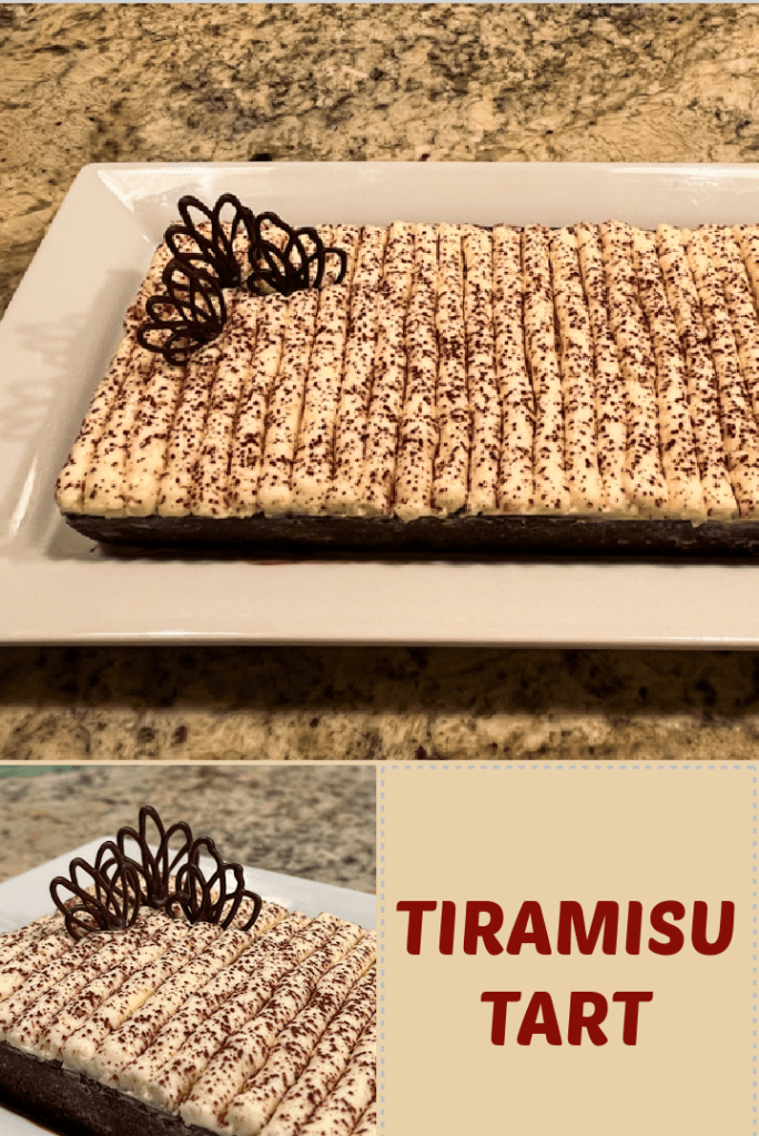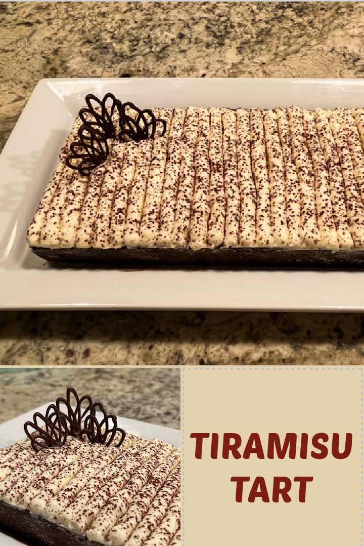 Tiramisu normally uses store-bought lady fingers, but in Kirsten’s version we go the extra mile and make our own, which is quite a fun little project. As you can see from the composite above, the lady finger batter is piped, baked and then the resulting layer is cut to fit exactly over the coffee-chocolate mousse spread in the bottom of the tart. I used THIS RECIPE for the mousse, adding 1 tsp of espresso powder to the heavy cream before incorporating into the chocolate.