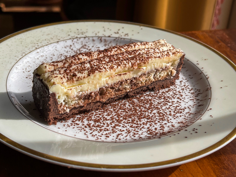 After baking, the sponge is soaked with a coffee-Marsala syrup.