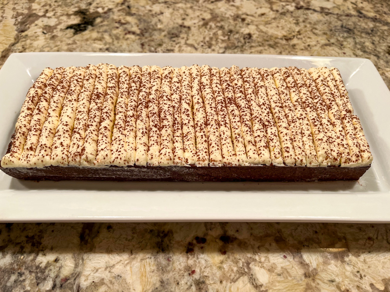 Once the sponge is placed on top, the mascarpone cream is gently spread on top, and the whole thing goes into the fridge for a little while. The last step is piping additional cream on top using either a grass tip like Kirsten does in the tutorial, or a regular round opening tip (which is what I did). A shower of cocoa powder closes the deal.