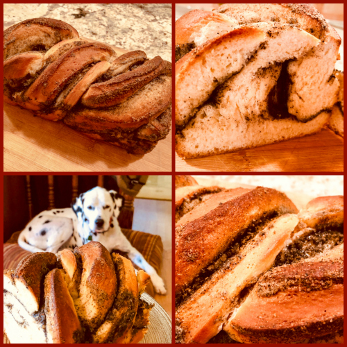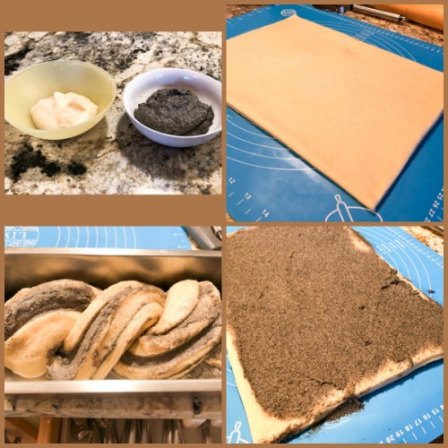 Once the dough is doubled gently deflate the dough and roll it out as a large rectangle. Spread the black sesame paste all over it, leaving a small border free of paste. Roll the dough from the long side, forming a cylinder, with the seam down. Using a sharp knife, slice the dough almost all the way through, and open the halves, exposing the center. Twist the two strands around, making sure the inner layers are facing up. Carefully drop it inside a loaf pan (9 x 5 in works fine), and allow it to rise covered for another hour, hour and a half. Meanwhile, heat the oven to 350F.