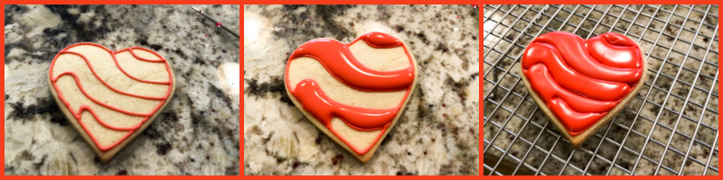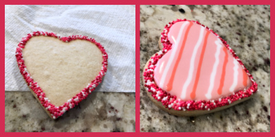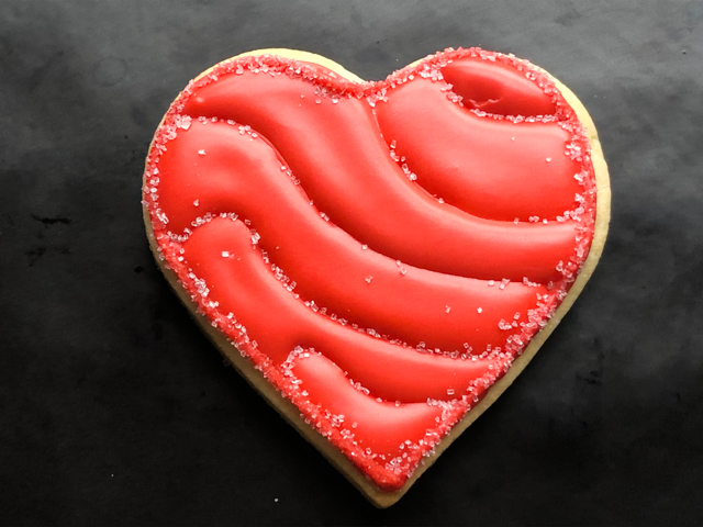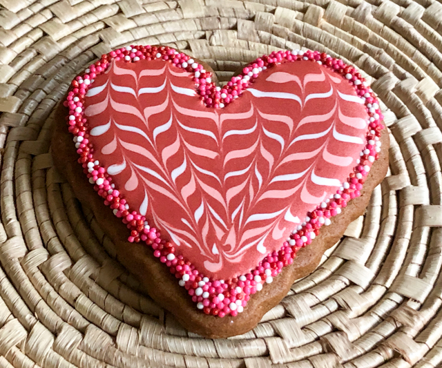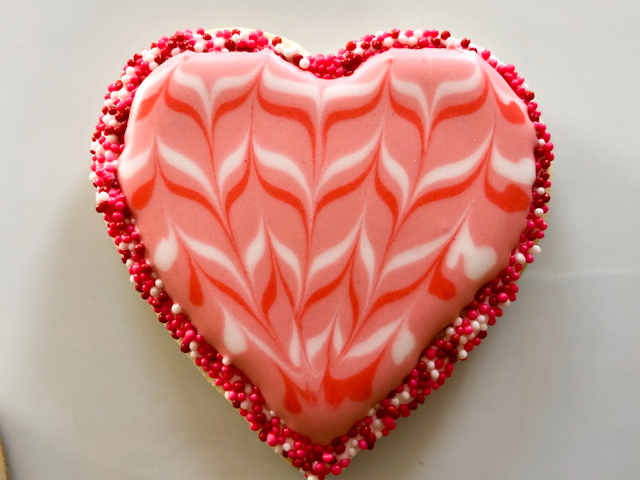 This is a pretty striking cookie that is so so easy to make! One thing that is hard when we start decorating sugar cookies is the edge. It always ends up a bit messy. By adding a border, you can say goodbye to that problem. Just pipe Royal icing and immediately touch the surface of the cookie on a layer of your favorite non-pareils (or sanding sugar). Let that dry for a few minutes, flood, quickly add lines of contrasting colors and work a needle or toothpick up and down, curving it gently to follow the overall shape of the heart. Detailed instructions here.