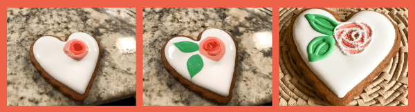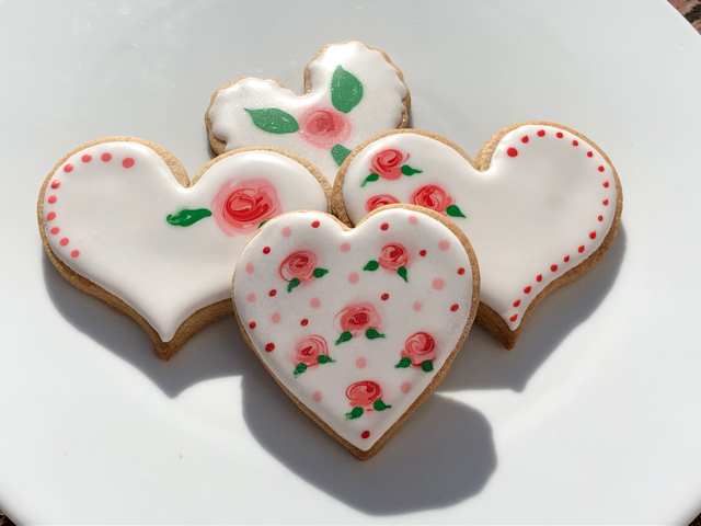 I was terrified of trying those, as they seemed way beyond my skill level. You can find countless youtube tutorials showing how it’s done, and in fact it is not that hard. You start by flooding in white (or any base color you like). Immediately add two or three concentric dots with the colors for the rose bud. Very slowly swirl them with a needle until you get the design you like. Add little dots of green and pull them with a needle to give them a leaf shape. Let it all dry completely and if you want, add additional bells and whistles. You can draw veins in the leaves, pipe their shape with thick royal icing, and add fine white lines on the rose buds for a completely different, almost modern look.