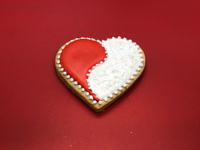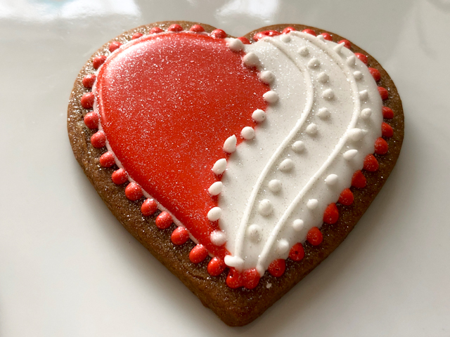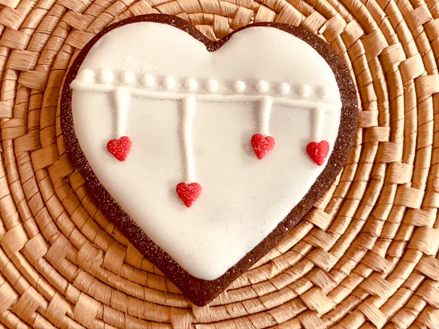 Are you going to roll your eyes to the ceiling if I tell you I loved making these? Ok, I won’t then. Start with a plain cookie, use a small cookie cutter to draw a small heart in the center. If you are brave, do it free-hand. Flood with red. Let it crust for 15 minutes, surround it with white. Let it fully dry, pipe the edge of the inner heart with white icing, and cover it with non-pareils or sanding sugar. It is a simple, but very elegant look.