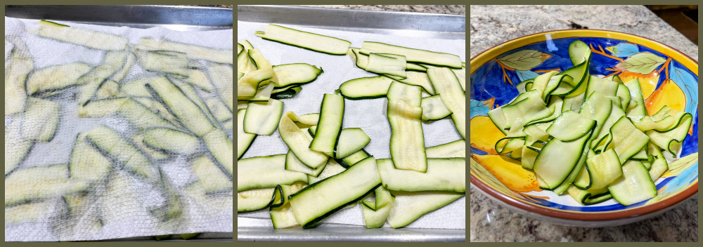 I adore zucchini and in this preparation it really shines! I strongly advise you to cut it with a mandolin, because paper thin is a must. You won’t have the same beautiful effect of that noodle appearance unless you really slice it super thin. Come to think of it, a veggie peeler might work also!